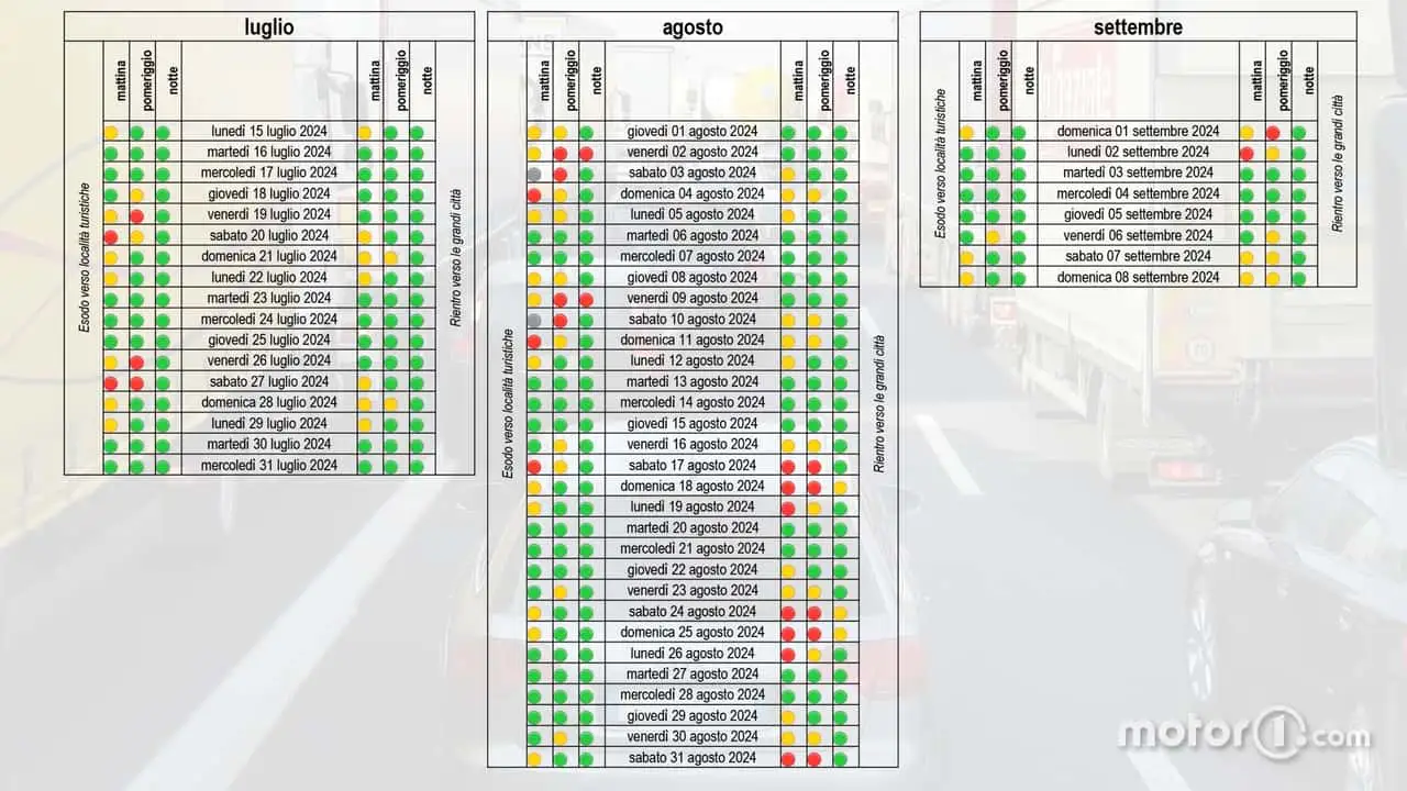 Guardando alle previsioni del traffico per agosto 2024 invece i famigerati bollini neri, quelli che indicano pesanti congestionamenti lungo la rete autostradale italiana, compaiono nelle mattine di sabato 3 e 10 agosto, naturalmente in direzione mare e montagna.