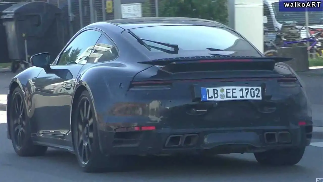 Purtroppo chi ha beccato il prototipo, ancora camuffato, in giro per la strada non ha osato superarlo e quindi abbiamo unicamente inquadrature del posteriore. Ma è proprio qui che la nuova Porsche 911 Turbo dovrebbe cambiare maggiormente rispetto alle sorelle. Guardate ad esempio gli scarichi: sono 4 e non 2 e hanno un nuovo disegno trapezoidale. Anche il paraurti è diverso e integra 2 piccole prese d’aria.