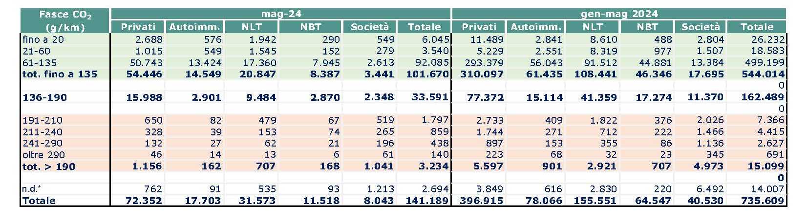 Numeri che seguono le dinamiche di mercato. Anzi, si discostano addirittura in favore dei privati. Guardando ai primi 5 mesi del 2024 infatti le auto con emissioni di CO2 comprese tra 0 e 20 g/km vendute sono state 26.232, 11.489 a privati e 11.902 a società, comprese quelle di noleggio a lungo e breve termine. Praticamente 50-50.
