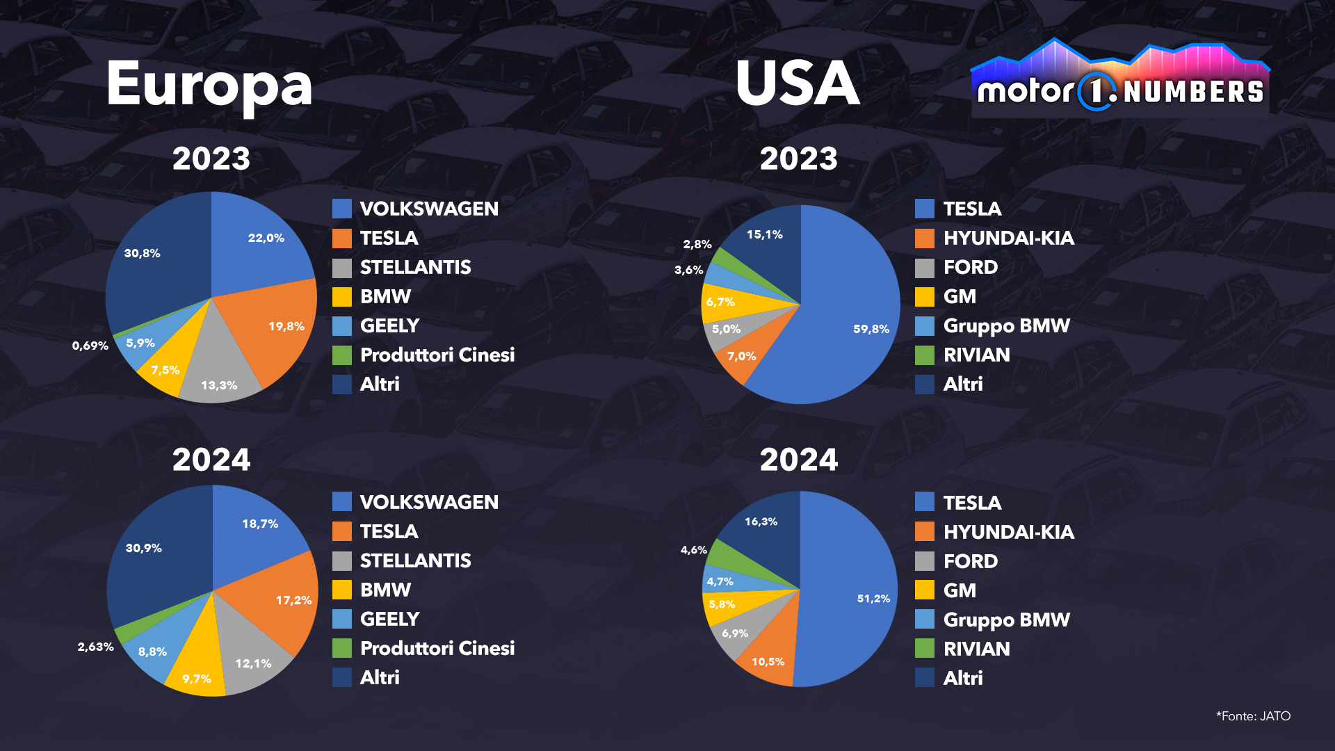 Non sembra essere un anno positivo per Tesla. Dopo i risultati record del 2023, quando non solo era il produttore di auto elettriche pure più popolare al mondo, ma anche il marchio del veicolo a batteria più venduto sul Pianeta (la Model Y), non sta crescendo come prima. Gli ultimi dati raccolti da JATO Dynamics per la prima metà di quest'anno mostrano che l'azienda di Elon Musk sta perdendo terreno sia negli Stati Uniti che in Europa: le vendite sono diminuite rispettivamente dell'8% e del 13%.