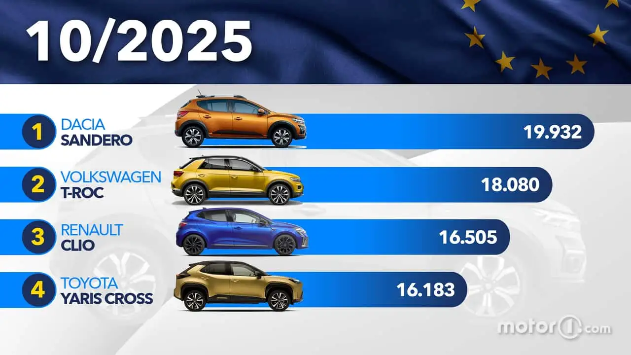 Secondo JATO Dynamics, a ottobre 2025 la Dacia Sandero resta al vertice delle immatricolazioni, pur segnando un calo su base annua, mentre la Volkswagen T-Roc emerge come uno dei modelli più dinamici grazie a una crescita a doppia cifra, confermando la forte domanda di SUV compatti.
